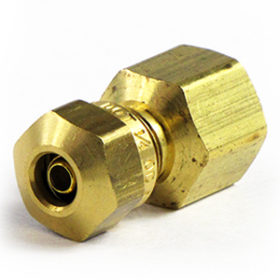 HP1152. 女性管子舱壁 材料:黄铜 拟合末端A:1/4“OD管 拟合端B:1/4“(-4)NPT女性 非点阵 |